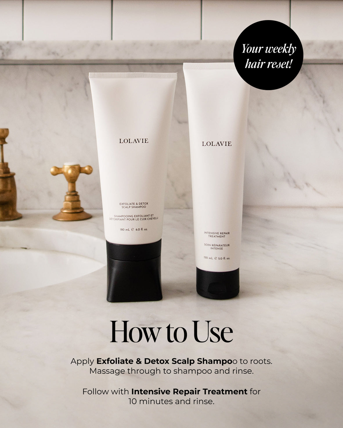 Once a week in shower, start with Exfoliate & Detox Scalp Shampoo by using the nozzle as a guide to section wet hair, revealing scalp and apply directly. Activate into a lather by vigorously massaging product into the roots. Shampoo through and rinse thoroughly. Follow with Intensive Repair Treatment by applying a generous amount from mid-lengths to ends. Wait 10 minutes and rinse. You can choose to skip your conditioner altogether or follow with the Restorative Conditioner if additional hydration is preferred.