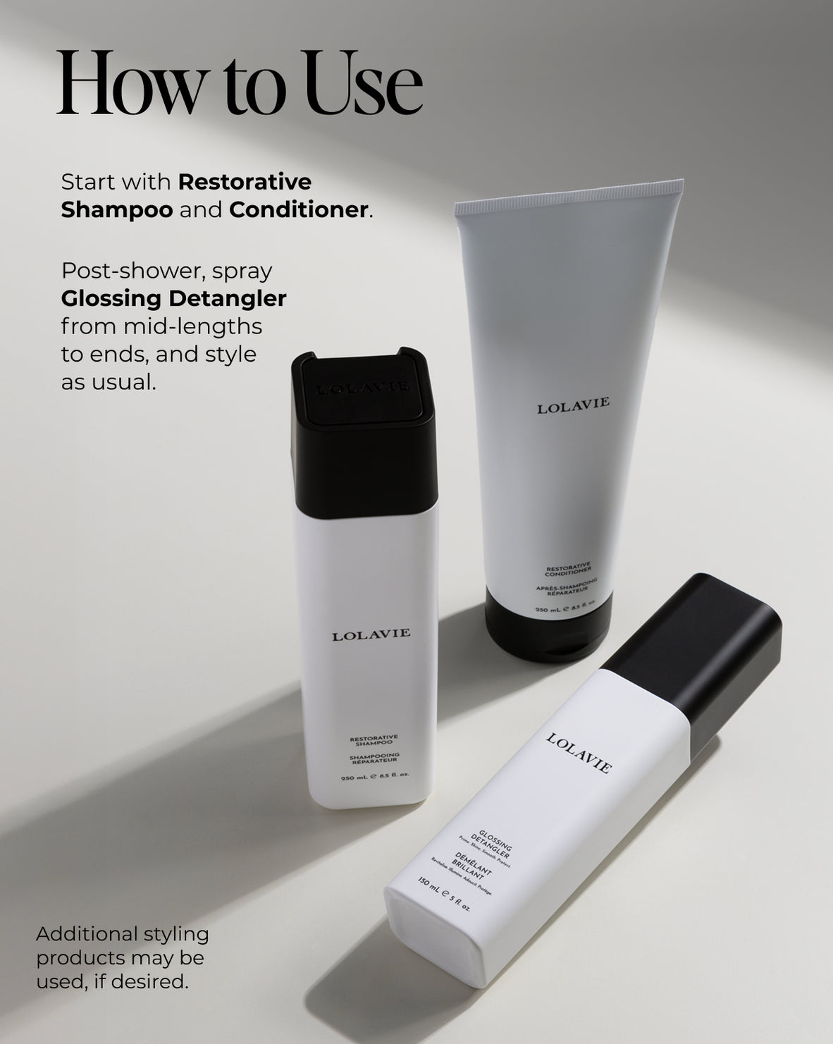 Post-shower, spray Glossing Detangler onto wet or towel-dried hair, focusing on mid-lengths to ends. Gently comb through with your fingers, a brush, or a wide-tooth comb. Follow with any additional styling products, then style as usual.