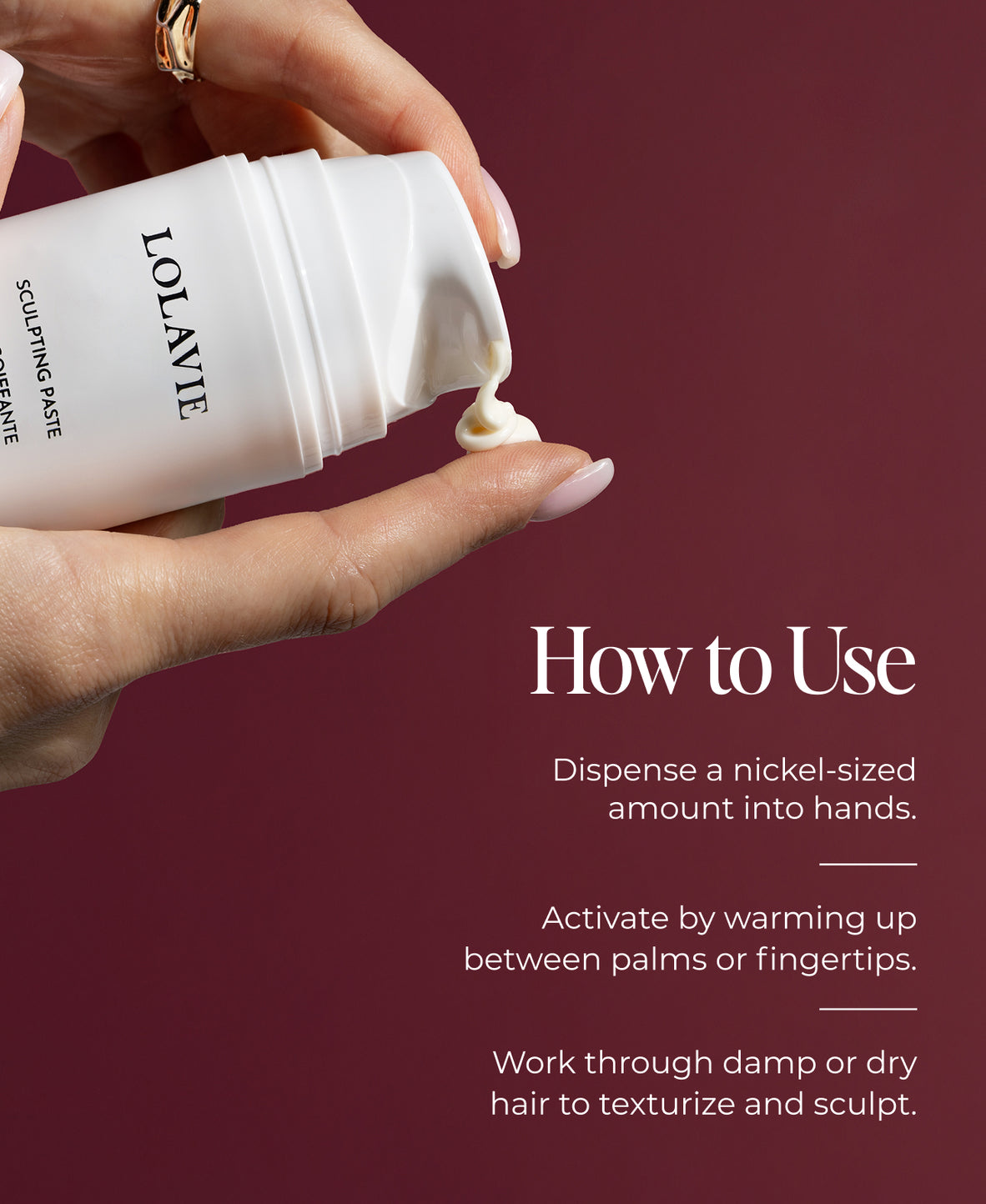 Start by dispensing a nickel-sized amount of paste into hands. Activate by warming up the product between palms or fingertips and work through damp or dry hair to texturize and sculpt natural style.